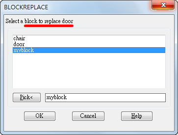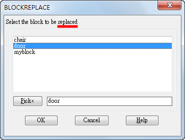透過在清單中選取或按一下「點選」按鈕,並在圖面中選取圖塊,指定搜尋的圖塊名稱: