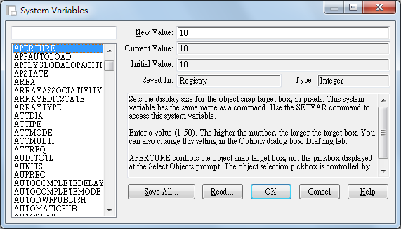 | Initial Value | 顯示亮顯於清單方塊中系統變數的初始值。此即為新圖面中的系統變數值。 |