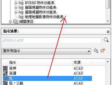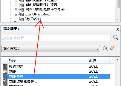 - 在「指令清單」窗格中,將要加入的指令拖曳至「<檔名> 中的自訂」窗格中的快顯功能表。