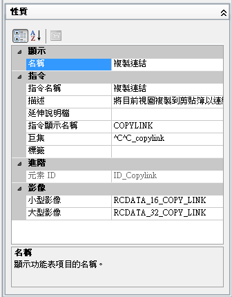 以下是在「複製連結」功能表項目的「名稱」性質加入一個波狀符號 (~) 之後,顯示在「編輯」功能表的結果。