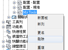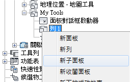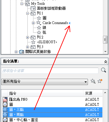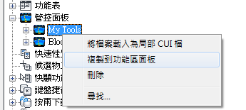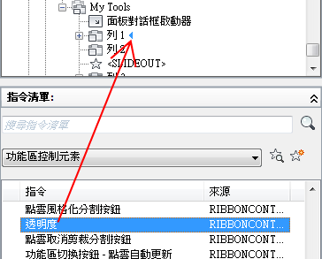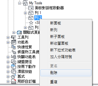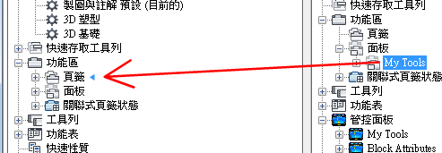 - 將新功能區面板從右側「<檔名> 中的自訂」窗格拖曳至左側「<檔名> 中的自訂」窗格中已載入 CUIx 檔的「面板」節點。