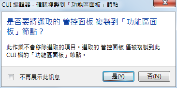 - 在「CUI 編輯器 - 確認複製到『功能區面板』節點」對話方塊中,按一下「是」。