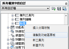 - 在要複製及轉換到功能區面板的工具列上按一下右鍵。按一下「複製到功能區面板」。
