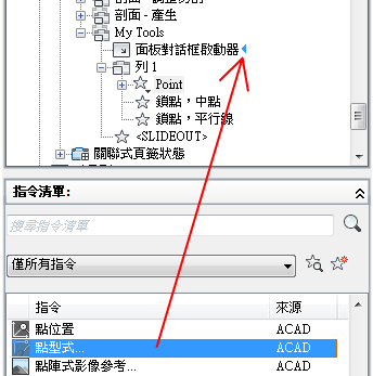 - 將指令從「指令」清單拖曳至面板上的「面板對話方塊啟動器」。