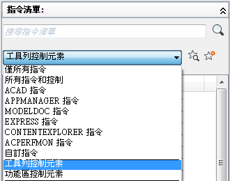 - 在「指令清單」窗格的「品類」清單中,選取「功能區控制元素」。