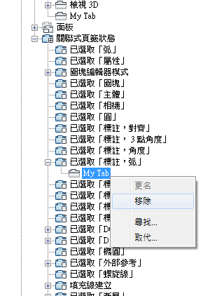 - 在關聯式頁籤狀態下的功能區頁籤上按一下右鍵,然後按一下「移除」。
