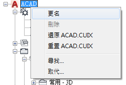 註: 在重置時,只有在程式安裝位置下方 UserDataCache 資料夾中找到的 CUIx 檔中可進行重置。