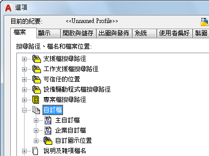- 在「選項」對話方塊的「檔案」頁籤中,按一下「自訂檔」旁的加號 (+),以展開節點。