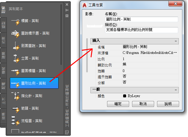 將工具放到工具選項板上之後,您可以變更其性質。例如,您可以變更圖塊的插入比例或填充線樣式的角度。