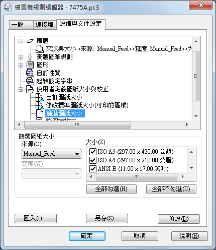 修改繪圖機規劃的設備特有性質。每一個繪圖機的設定不同。若繪圖機製造商未包括設備驅動程式的「自訂性質」對話方塊,無法使用「自訂性質」選項。