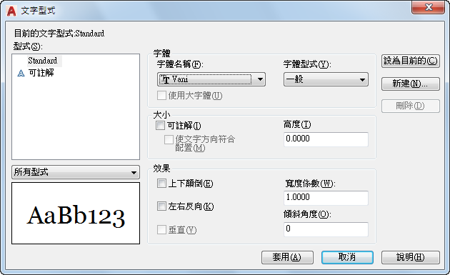 指定字體字元的格式,如斜體、粗體或標準。如果選取「使用大字體」,此選項變成「大字體」名稱,且可用來選取「大字體」檔名。
