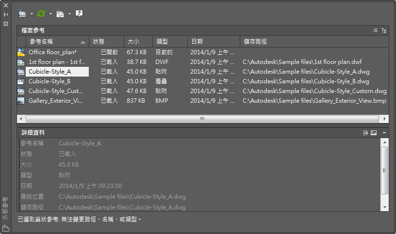 - 在目前圖面中顯示參考清單,包括狀態、大小、建立日期等資訊。