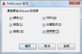 將所選物件與已解鎖圖層上插入的圖塊的顏色、線型、線粗、材料、出圖型式和透明度性質取代變更為「依圖層」。