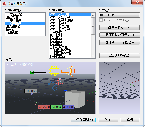 介面環境就是環境,例如模型空間。根據介面環境,可以為介面元素指定不同的顏色。您所選取的介面環境會顯示相關聯元素的清單。選取介面環境、介面元素,然後選取一種顏色。