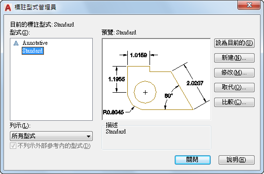顯示目前標註型式的名稱。預設標註型式為 STANDARD。目前的型式會被套用到您建立的標註。