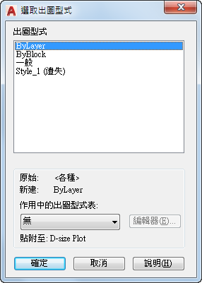 設定貼附到目前圖面的出圖型式表。出圖型式表會定義出圖型式。
