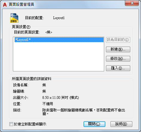 從「圖紙集管理員」開啟「頁面設置管理員」時會顯示。