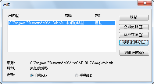 切斷物件和來源檔的連結。圖面中的物件將變更為 WMF (Windows 中繼檔格式),即時將來原始檔發生變更也不受影響。