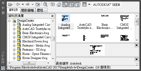 使用左側的樹狀檢視可以瀏覽內容的來源,並於右側內容區域顯示內容。您可以使用內容區域將項目加入圖面或工具選項板。預覽或描述會針對選取的圖面、圖塊、填充線樣式或外部參考加以顯示。