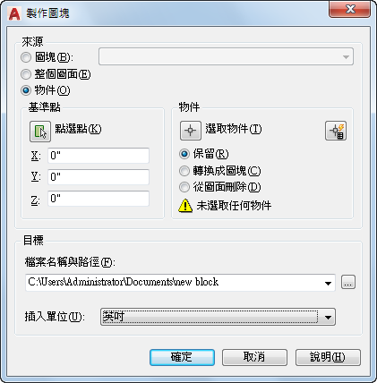 指定檔案的新名稱與位置,以及插入圖塊時使用的測量單位。