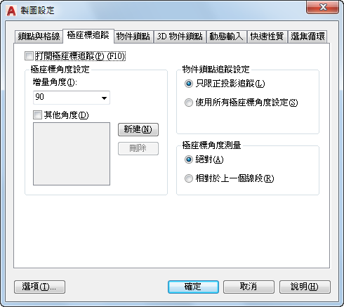 使清單中的其他角度可用於極座標追蹤。(POLARMOD 和 POLARADDANG 系統變數)