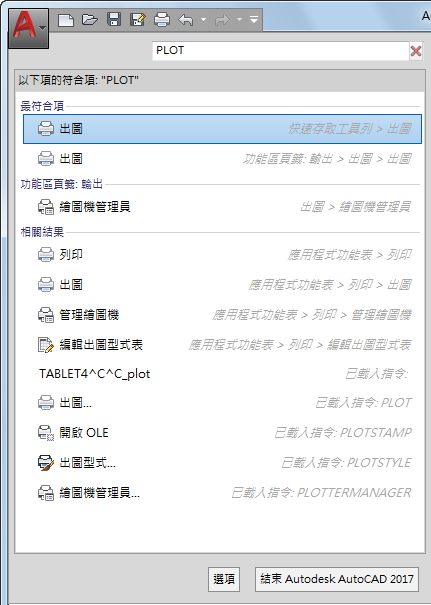 「指令搜尋」欄位會顯示在應用程式功能表的頂部。搜尋結果可能包括功能表指令、基本工具提示和指令提示文字字串。您可以輸入任何語言的搜尋條件。結果會套用至目前的工作區。