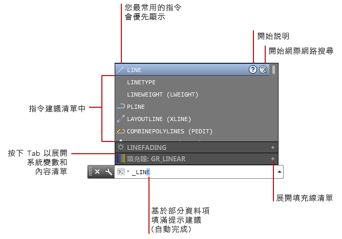 當您在指令視窗中或是動態輸入方塊中輸入指令的前幾個字母時,建議的指令清單會隨即顯示。依預設,清單具有以下特性: