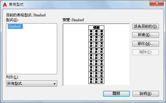 刪除在「型式」清單中選取的表格型式。但無法刪除圖面中正在使用的型式。
