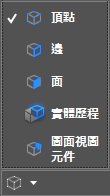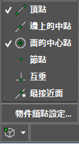 當您移動游標時鎖點游標至最近的 3D 參考點。例如頂點、邊緣上的中點和最接近的面等。 |