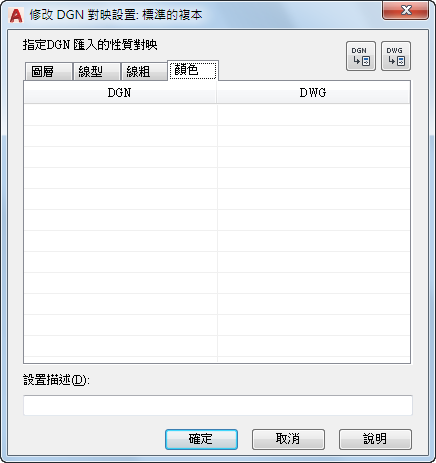 匯出對映設置:如果您已透過從「匯出 DGN 設定」對話方塊中建立新設置來存取「修改 DGN 對映設置」對話方塊,則「DWG」欄將包括目前圖檔中所有已定義的線型。當目標儲存格 (右欄) 為空時,將使用預設系統對映。