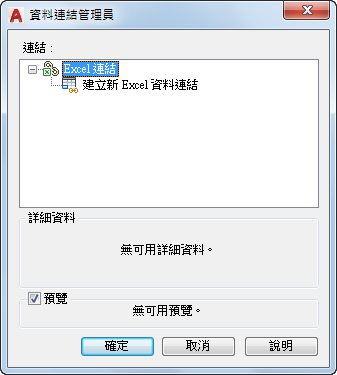 列示圖面內的 Microsoft Excel 資料連結。如果圖示顯示為連結鏈,則此資料連結有效。如果圖示顯示為中斷鏈,則此資料連結已中斷。