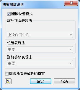 由於某些指令在快速模式下不可用,因此您可以根據唯一檔案門檻值,設定預設開啟行為。這可讓您在快速模式下開啟大型組合,而較小或不太複雜的組合則會完全開啟。