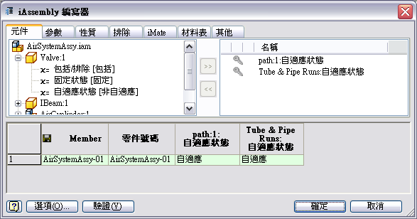 - 完成所有其他 Inventor iAssembly 性質後,按一下「確認」以確認組合規劃。例如,一個主要管路組合成員在 iAssembly 工廠中僅能成為自適應一次,並且「材料表數量」欄僅能包含一個數值或一個字串 Default。