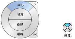 註: 在 IDW 檔中,僅 2D 導覽操控盤可用。該操控盤中包含「平移」、「縮放」和「倒轉」三個楔形塊按鈕。在 DWG 視圖中,ViewCube 和所有 3D 操控盤均可用於模型視圖中,僅 2D 操控盤可用於配置視圖中。