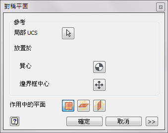 - 若要將對稱平面與 UCS 對齊,請按一下「局部UCS」按鈕,並選取一個作用中的 UCS 做為對稱平面的參考。對稱平面建立於 UCS 的本端 XY 平面。