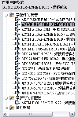 首次開啟「粗細管型式」對話方塊時,瀏覽器清單會自動展開到作用中的型式的位置。顯示的作用中的型式取決於目前的粗細管環境。作用中的型式顯示在型式瀏覽器上方的唯讀輸入方塊中。其還在瀏覽器清單中以粗體亮顯。