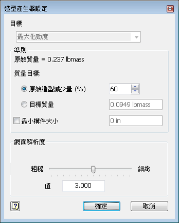 「造型產生器設定」可讓您設定設計目標、準則和網面解析度。