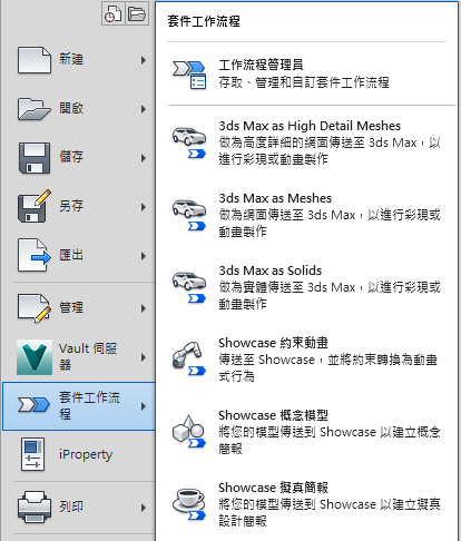 套件工作流程是一種機制,用於將來源 Autodesk 產品中的工程設計匯出至目標產品,以取得詳細的彩現或動畫。工作流程中的設定會自動轉換設計物件,以便在 3ds Max 或 Showcase 中呈現。例如,3ds Max 外部彩現工作流程會彩現建築設計的外表面,包括光源和陰影。Showcase 約束動畫工作流程展示運動中的機械組合,將範圍約束轉換為動畫式行為。您可以使用工作流程來準備進行設計審閱,以及建立生動的簡報。
