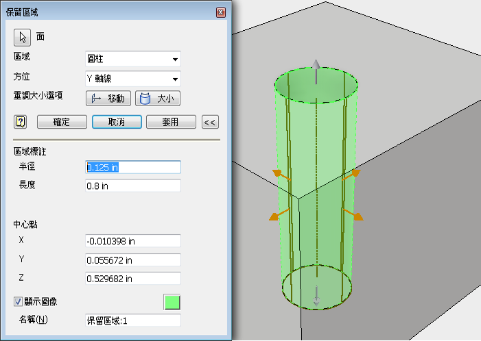 - 如有必要,展開「保留區域」對話方塊,並手動修改區域的中心點和標註。您也可以調整圓柱類型區域的方位。完成時按一下「確定」。