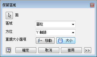 - 將「重調大小選項」設定為「大小」,然後拖曳保留區域邊界上的箭頭,來調整要保留的區域大小。您可以控制方塊的高度、長度和寬度,或控制圓柱的半徑和長度。