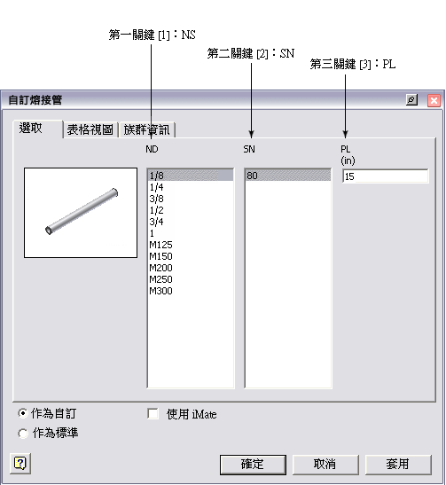 管 iPart 一般具有三個族群主鍵欄:標稱大小、列表號碼和管長。對於範例管 iPart: