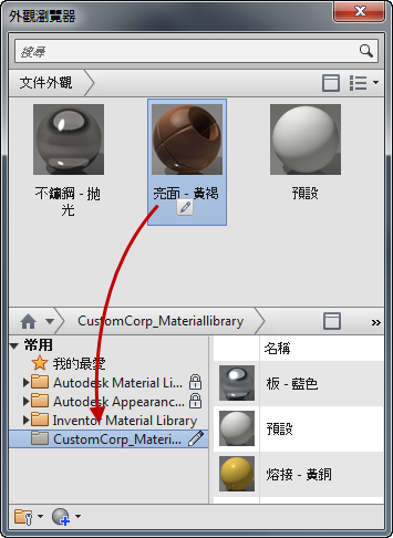 - 從「文件外觀」區段中,將要保留的所有外觀拖放到自訂資源庫中。可以將其放在品類節點或資源庫節點上。