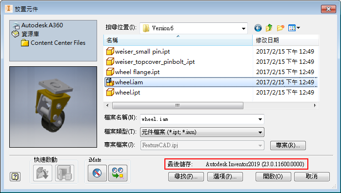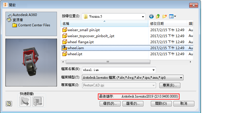- 瀏覽並選取要開啟的未來版本的組合檔 (.iam)。