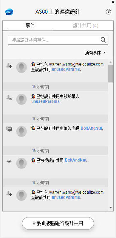 如果協同合作者具有 Inventor 2016 R3 或 Inventor 2017,並在 Inventor 中登入至 A360,則可以使用 Inventor 針對設計共用進行協同合作。