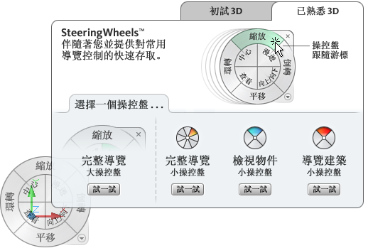SteeringWheels (也稱為操控盤) 是追蹤功能表 (會跟隨游標)。SteeringWheels 將許多常用導覽工具組合成單個介面。