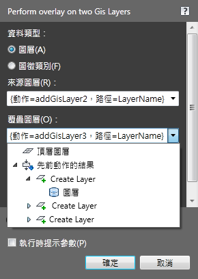 有一個捷徑可以用來加入動作並將其自動併入到前一個動作。在動作上按一下右鍵,然後按一下要加入的動作。例如,在一個覆疊動作上按一下右鍵,然後按一下「加入圖徵圖層」,以建立一個新顯示管理員圖層,用於儲存覆疊作業的輸出。