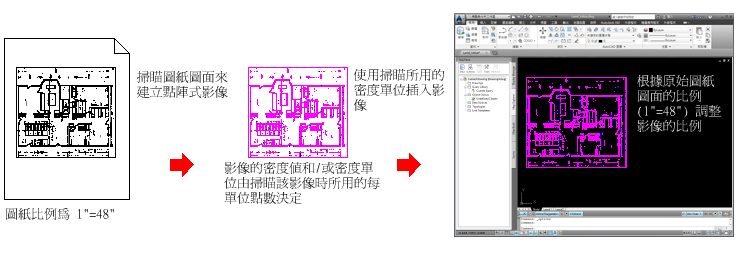 以下範例中的影像是按照 1" = 48" 的圖紙比例繪製、以每英吋 300 個點掃瞄,然後使用 300 作為密度值、「英吋」作為密度單位插入圖面的。然後,根據 1" = 48" 的圖紙比例調整它的比例。