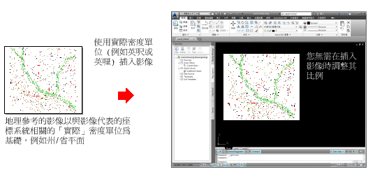 以下範例展示了密度單位與地理參考影像之間的關係。由於無需考慮圖紙比例,因此您可以使用影像表示的單位 (例如英呎或英哩) 插入影像,並且插入時無需調整影像的比例。