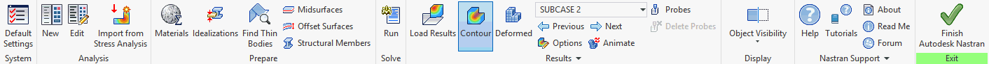 有載入結果的 Autodesk Nastran 功能區頁籤 (展開「結果」面板;隱藏「設置」、「接觸」和「網格」面板):