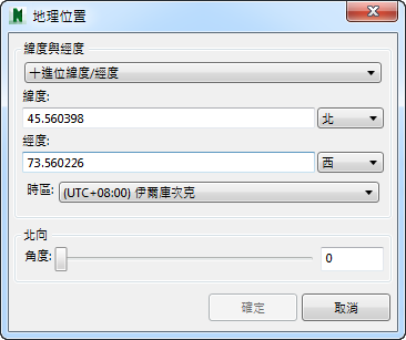 使用此對話方塊可以在模型中設定地理位置的緯度、經度和北方向。「場景視圖」會展示太陽在自訂時區的自訂位置。